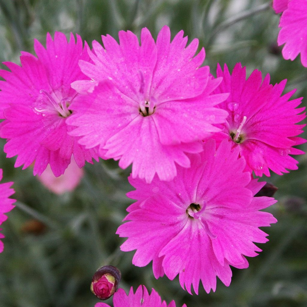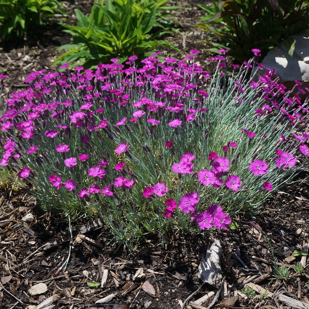 Dianthus gratianopolitanus ‘Feuerhexe’ (Firewitch) is a low growing, mat-forming alpine plant with narrow bluish-gray foliage that remains evergreen. Brilliant purplish-pink flowers cover the plant at bloom time. The flower color has also been variously described as hot pink or purple red or magenta. The color combination of the foliage and flowers is striking at peak bloom in mid-spring. And if that weren’t enough, the air becomes perfumed from the scented flowers which have a spicy and clove-like fragrance. Peak bloom is mid- to late spring with rebloom occurring in the summer and fall especially when the spent flowers are removed. The foliage height is 3 to 4 inches with flower stems reaching to 8 inches. This favorite Cheddar pink is hardy from USDA zones of 3 to 9.